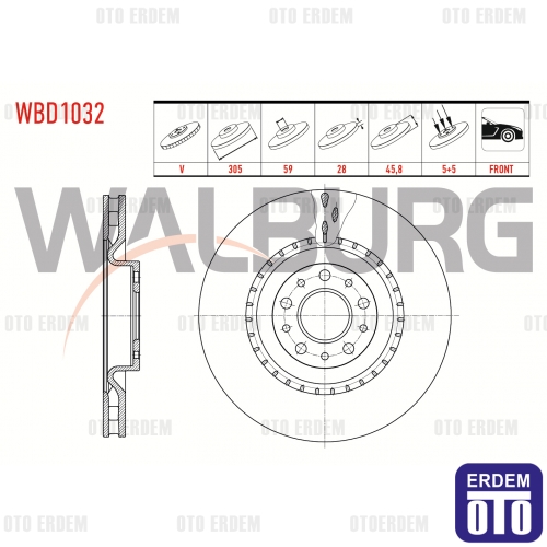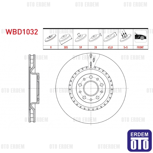Bu havalı (ventile) ön fren diski, Fiat Doblo Maxi modelleri için uygundur. Teknik özellikler: Ölçüler (mm): 305 x 28 x 59 x 45,6; Bijon sayısı: 5; Havalı/ventile yapıda. Uyumlu model ve motor bilgileri: Fiat Doblo Maxi 1.6 Mjt (2010-), Fiat Doblo Maxi 1.3 Mjt (2010-), Fiat Doblo Maxi 1.4 (2010). Ürün, üretici standartlarına uygun ölçü ve montaj özelliklerine sahiptir ve disk/kaliper uyumuna göre doğrudan takılabilmektedir. Yüksek ısı dayanımı ve aşınma direncine sahip malzemeden üretilmiş olup yüksek dayanıklılık ve uzun ömürlü kullanım sunar. Özel yüzey işlemi sayesinde sessiz ve titreşimsiz sürüş sağlar ve yüksek fren performansı ile güvenli sürüş sağlar.