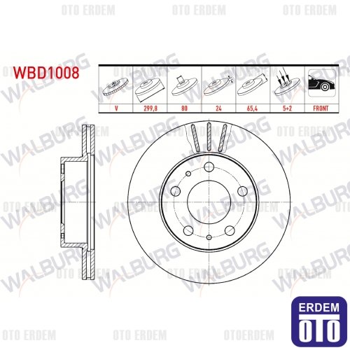 Bu havalı ön fren diski, aşağıdaki modeller için uygundur: Fiat Ducato (1994-), Peugeot Boxer 1-2-3-4 (1994-), Citroen Jumper 1-2-3-4 (1994-), Karsan Jest (2012). Teknik özellikler: Ölçüler 299,8 x 24 x 80 x 65,4 mm; 5 bijonlu montaj; havalı (ventile) yapı. Ürün, üretici standartlarına uygun ölçü ve montaj özelliklerine sahiptir ve doğrudan takılabilmektedir. Yüksek ısı dayanımı ve aşınma direncine sahip tasarımı ile uzun ömür ve yüksek dayanıklılık sunar. Özel yüzey işlemi sayesinde sessiz ve titreşimsiz sürüş sağlar ve yüksek fren performansı ile güvenli sürüş sağlar.